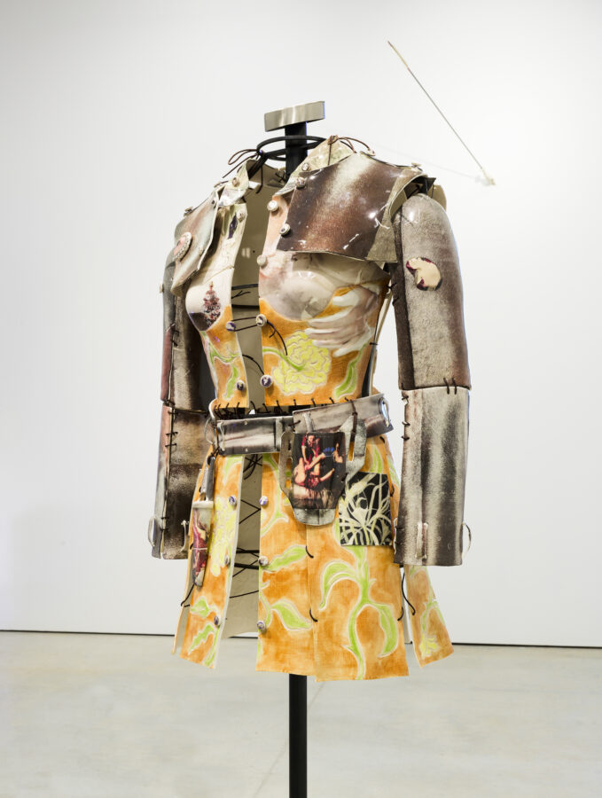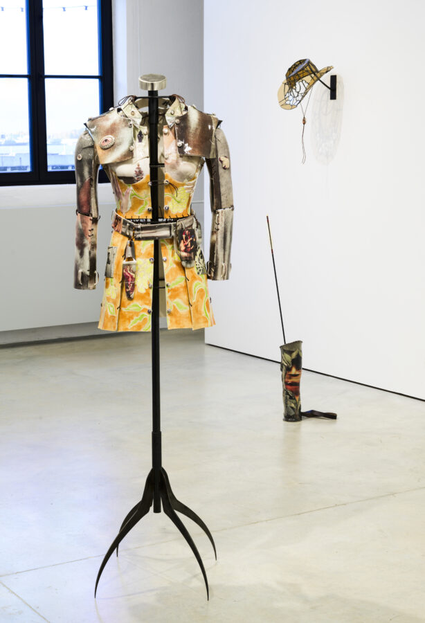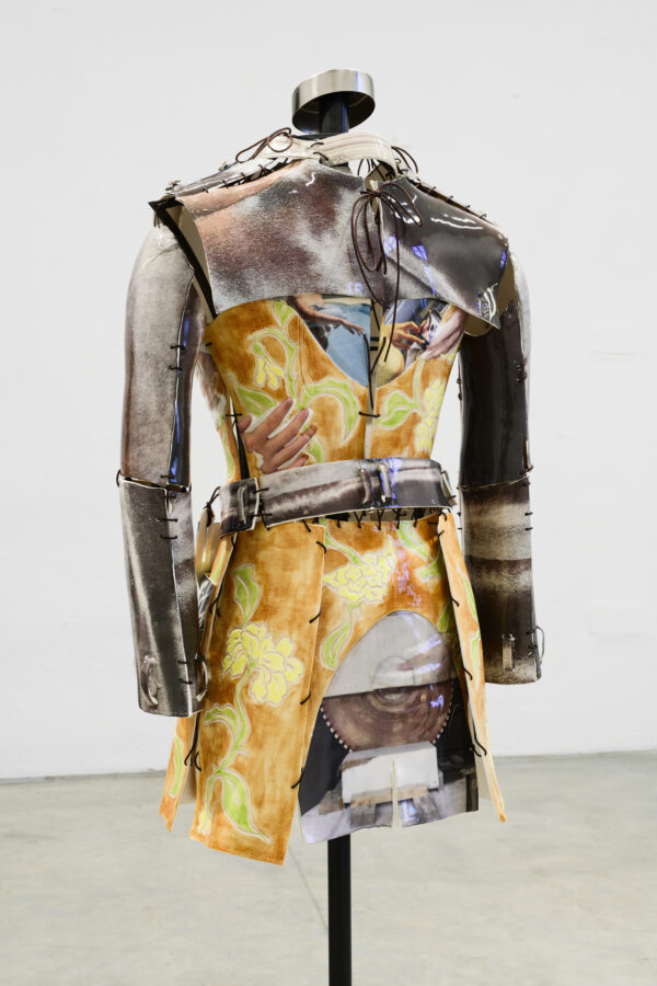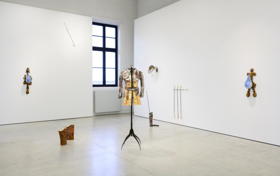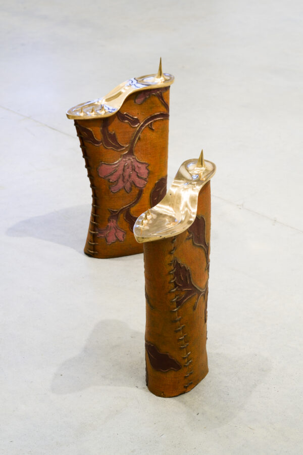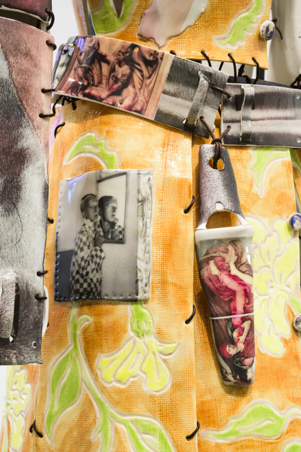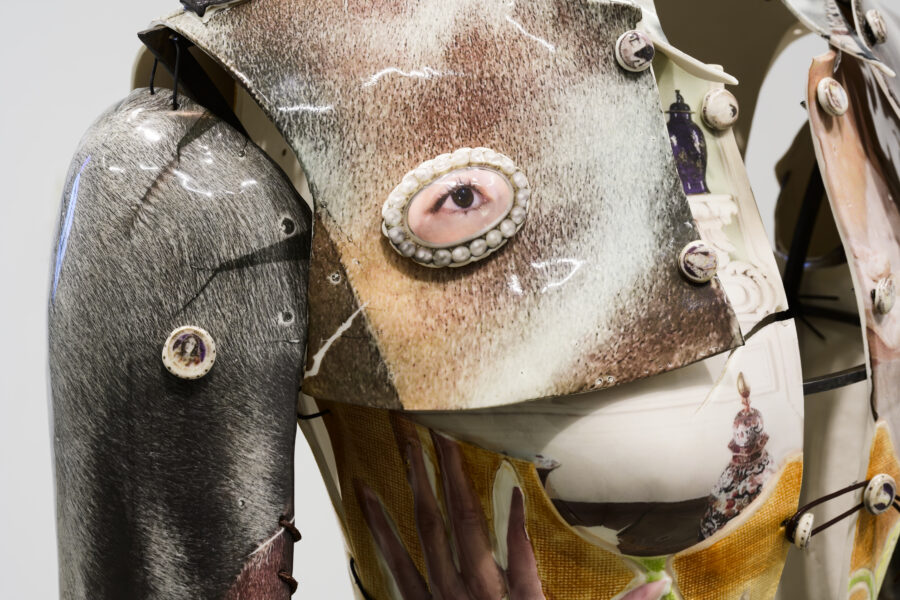 These historical identities all connect at the level of the racialized and gendered body, which is referred to in imagery found in the sculptures. Blending together both personal experiences as well as art history, these details express the complex nature of femme power and performativity in forced contact with the influence of cultural norms, the patriarchal gaze, and the environment at large. Included, for example, are references to the works of non-male artists such Claude Cahun, Properzia de’ Rossi and Artemisia Gentileschi. The tension between the body and its covers is further made visible through colourful chinoiserie patterns, elements of intrusive hands and motifs of tear-stained eyes and Artemis’ arrows.