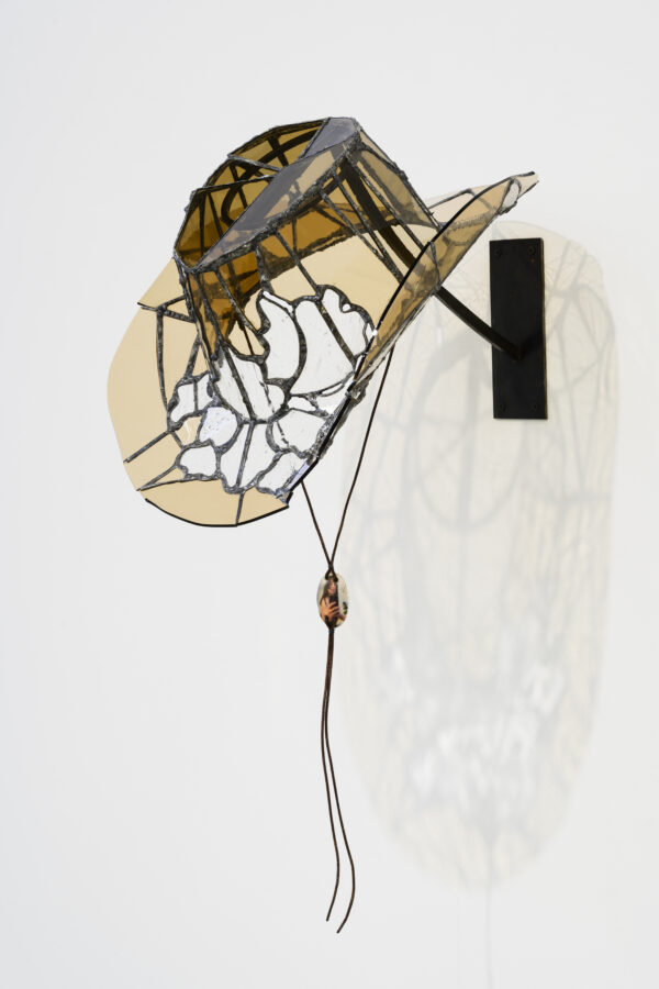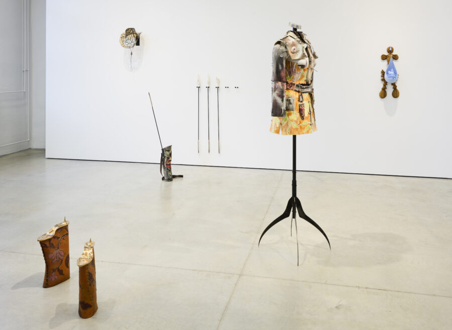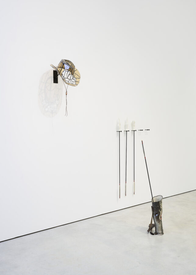 Faux Bone China is a series of sculptures consisting of a cowboy hat made of glass, porcelain parts bound into a protective jacket, chinoiserie patterned cast bronze chopine heels, and ceramic archery equipment. Through contrasting physically heavy but visually delicate materials, the sculptures evoke a tension between the body and the proposed dressware. Though they are intended to protect or to empower, the objects ultimately become a burden to their bearer. The artworks trace historical pathways of cultural, social, and individual identities that have been neglected or misrepresented in Western art history.