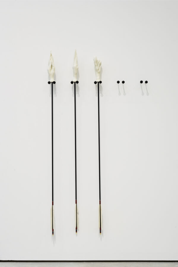 2024-2025 || Artemis (arrows) | Porcelain, glaze, ready made object (Kyūdō arrow), steel | 116 x 6 x 6 cm per arrow || From the exhibition “Saline Binds”, duo exhibition, Temnikova & Kasela, Tallinn 2024.||Photography by Stanislav Stepashko.