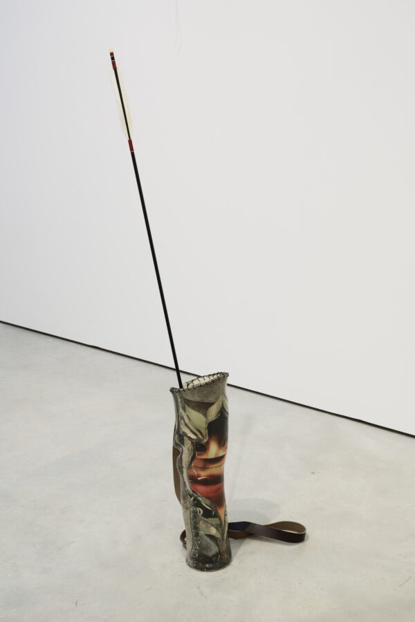 2024 || Artemis (a quiver) | Ceramic, glaze, ceramic decals (on-glaze), leather | 45 x 14 x 15 cm || From the exhibition “Saline Binds”, duo exhibition, Temnikova & Kasela, Tallinn 2024.||Photography by Stanislav Stepashko.