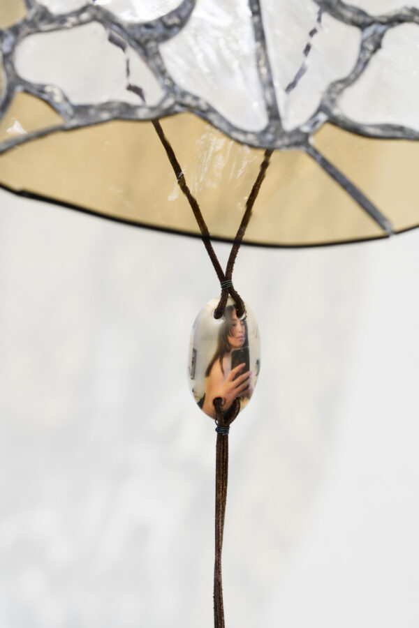 2024 || self-portrait 01 | Glass, patinated tin, porcelain, glaze, ceramic decals (on-glaze), leather, steel | 40 x 30 x 37 cm || From the exhibition “Saline Binds”, duo exhibition, Temnikova & Kasela, Tallinn 2024.||Photography by Stanislav Stepashko.